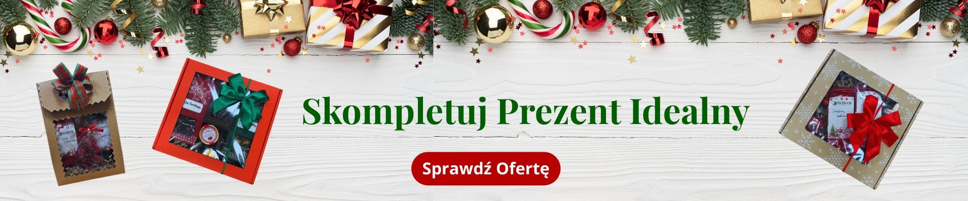 Mieszanki herbat, aromatyczne kawy, czekolady i miody zapakowane w eleganckie, ekologiczne pudełka, folię lub kosze.