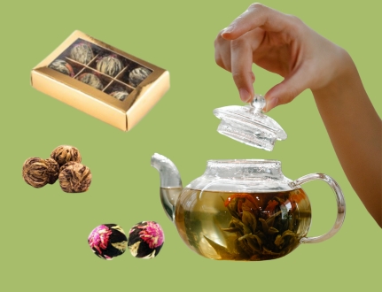 Herbaty kwitnące najlepiej zaparzać w przeźroczystym czajniczku o pojemności około 600ml. Kuleczka delikatnie się rozwija i ukazuje swoje piękno w postaci rozkwitającego się kwiatu.