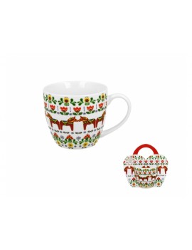 Kubek z motywem ludowym w koniki. Zapakowany w ozdobny kartonik-koszyczek.
