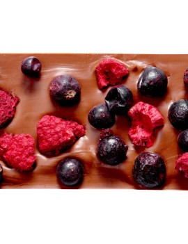 Składniki: czekolada mleczna bio (cukier trzcinowy bio, tłuszcz kakaowy bio, mleko pełne bio w proszku, miazga kakaowa bio, emulgator: lecytyna sojowa bio), czarna porzeczka liofilizowana bio (2,8%), malina liofilizowana bio (2,8%). Masa kakaowa minimum 38,8%
