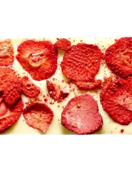 Składniki: czekolada biała bio (cukier trzcinowy bio, tłuszcz kakaowy bio, mleko w proszku pełne bio, emulgator: lecytyna sojowa bio), truskawka liofilizowana bio 5,7%