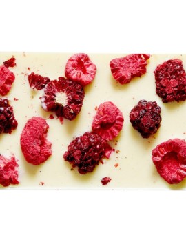 Składniki: czekolada biała bio (cukier trzcinowy bio, tłuszcz kakaowy bio, mleko w proszku pełne bio, emulgator: lecytyna sojowa bio), malina liofilizowana bio (2,8%), jeżyna liofilizowana bio (2,8%)